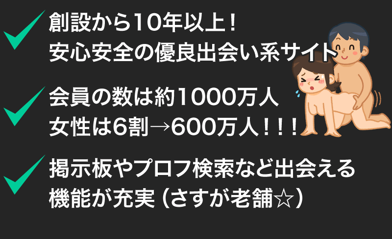 女の子に人気で、アダルトな出会いを求めてる女性が多いPCMAXはSEX出来る出会い系サイトです!10年以上運営しているサイトですが、今でも大人気でネットナンパには欠かせないとその界隈では評判なのです。